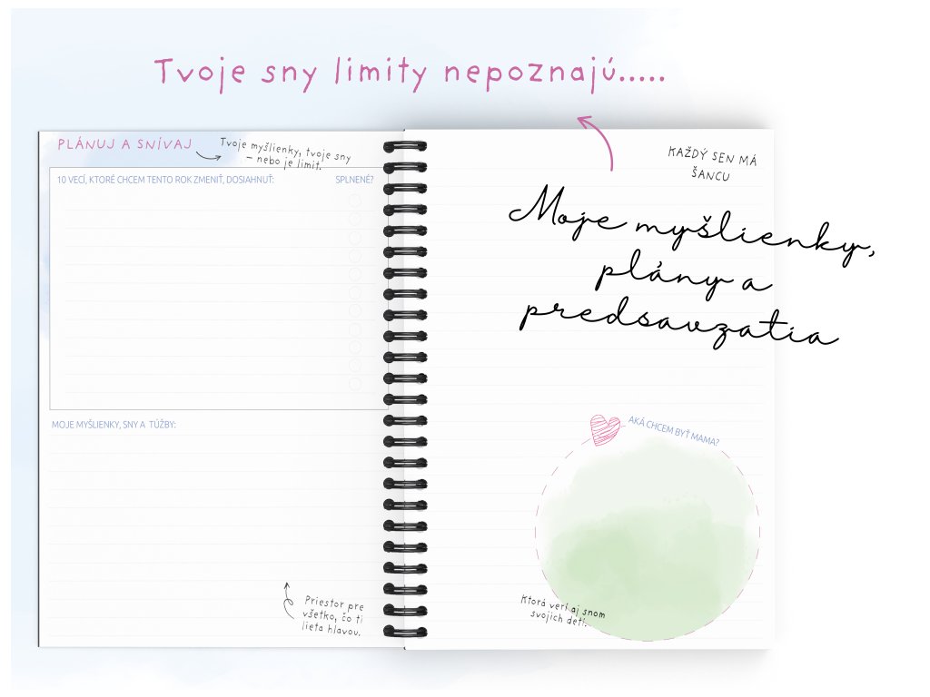 Diár je aj o pocitoch a snoch. Nie sme len mamy, sme aj ženy. Preto v ňom nájdete priestor aj na svoje myšlienky, sny, plány, predsavzatia.