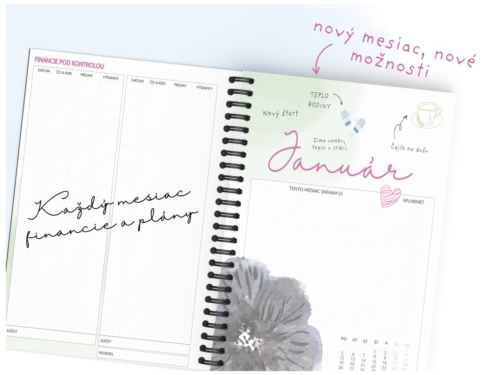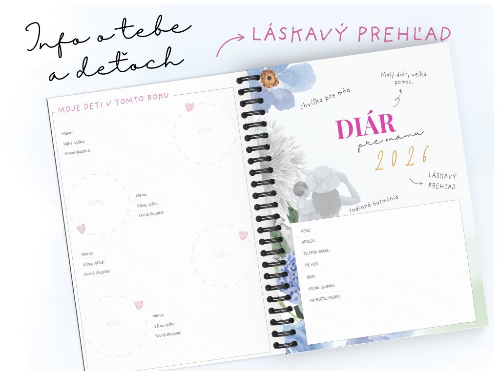 Diár vám pomôže organizovať rodinný čas – prácu, domácnosť, detské aktivity – a zároveň plánovať financie či dovolenky. Budete mať priestor zapisovať zážitky, ktoré si chcete uchovať, a dopriať si chvíľky len pre seba.